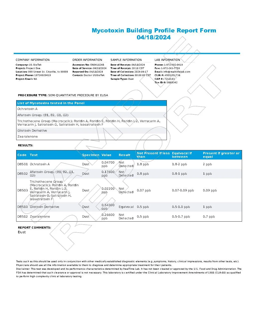 The Mycotoxin Building Profile is a dust swab collection test that detects the presence of 16 mycotoxins in your home, office, or other potentially affected areas.